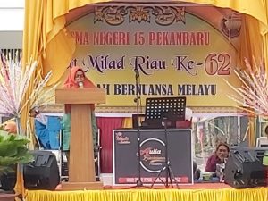 amu yang hadir diantara koordinator Pengawas Provinsi Riau Drs. Joyo Yosma, M.M, Anggota DPRD Riau Ade Hartati, M.Pd, Ketua Komite Sekolah, Lurah, dan jajarannya, juga orang tua wali murid. Kepala SMA Negeri 15 Pekanbaru, ibu Hj. Elmi Gurita, M.Pd mengatakan kegiatan festival seni dan bazar yang diadakan dihalaman sekolah tersebut untuk mensinergikan antara dunia pendidikan dan pemerintah provinsi Riau. Dijelaskan oleh ibu Kepala sekolah yang sehari-hari disapa bu Elmi ini, makna dari 62 tahun merupakan masa untuk mempersiapkan generasi emas yang siap untuk berjuang untuk mewujudkan Indoensia cemerlang dimasa yang akan datang. Dengan adanya kerjasama yang baik SMA Negeri 15 dan pemerintahan Provinsi Riau, akan meningkatkan karakter budaya melayu.